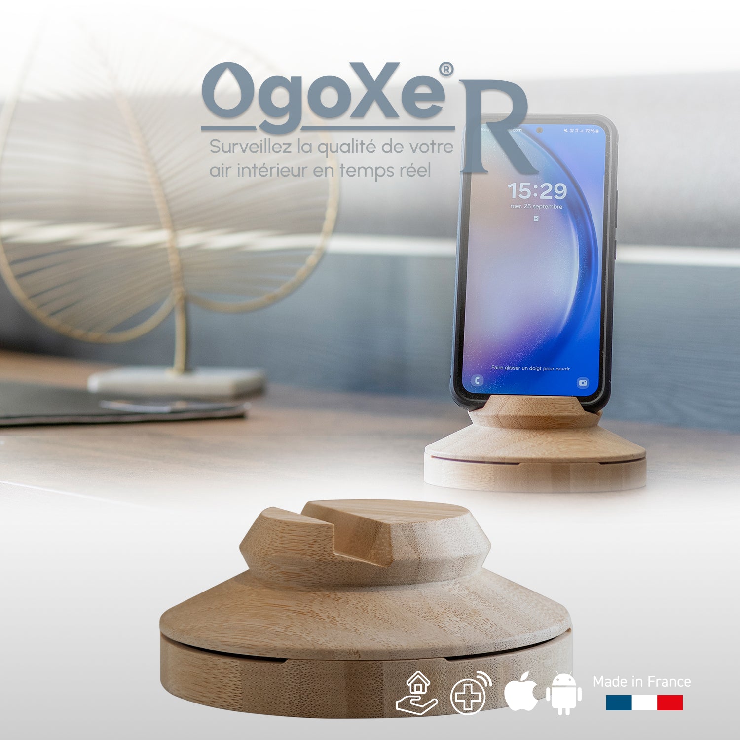 Avec sa base en bambou écoresponsable, l'Ogoxe-R Socle Mobile allie innovation et praticité. Son socle sert également de support pour mobile ou tablette, s'intégrant facilement dans votre quotidien tout en respectant l'environnement.